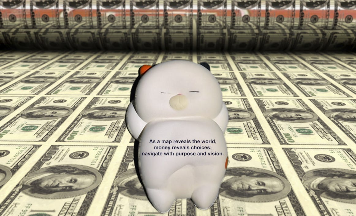 As you give me a gentle squeeze today, my belly reveals a thought-provoking message: "As a map reveals the world, money reveals choices; navigate with purpose and vision." In the grand tapestry of life, money serves as a tool, a medium that unveils myriad paths and destinations. Yet, like any map, the value lies not in the possession but in the wisdom to use it.
